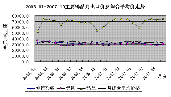 同期比較,鎢品出口價(jià)格延續(xù)了2006年的平穩(wěn)態(tài)勢,綜合平均價(jià)格一直在3萬美元/噸金屬以上小幅波動,并且穩(wěn)中略有上升。鎢材、硬質(zhì)合金混合料、鎢酸鈉和鎢絲的出口價(jià)格分別比去年上升83.11%、2.59%、4.51%和1.82%,其他鎢品價(jià)格略有下降。(見主要鎢品月平均價(jià)格和月綜合平均價(jià)格走勢圖)