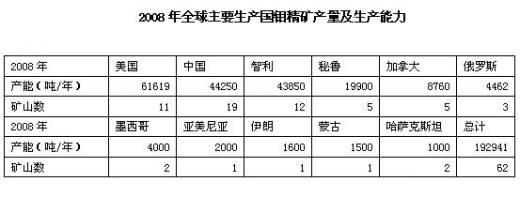 加拿大金屬經(jīng)濟(jì)小組統(tǒng)計(jì)了2008年全球鉬精礦主要生產(chǎn)國的礦山62座,生產(chǎn)能力(金屬量)為19.29萬噸/年。從生產(chǎn)能力來看美國、中國、智利、秘魯位居前四。