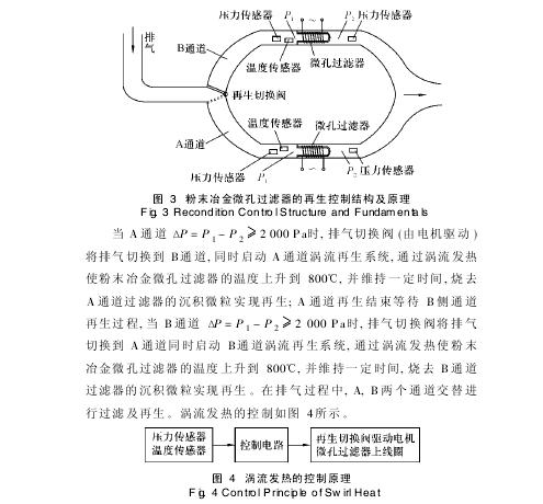 在發(fā)動(dòng)機(jī)排氣管道設(shè)置兩個(gè)通道,每個(gè)通道安裝一套粉末冶金微孔過濾器及其再生裝置,其中包括溫度傳感器、壓力傳感器及渦流再生微孔過濾器。