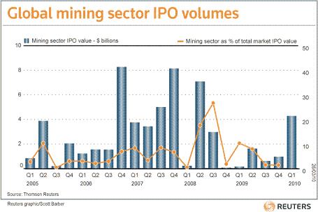倫敦3月29日電,一些礦業(yè)公司正迫不及待準(zhǔn)備進(jìn)行股票掛牌上市,但在投資人挑精揀肥,只愿意對(duì)一線大廠捧場的情勢(shì)下,這些礦商或許不得不轉(zhuǎn)往其他市場集資. 分析師指出,許多礦業(yè)公司可能會(huì)決定向中國及其他亞洲企業(yè)出售股權(quán),或是同意簽訂長期供應(yīng)協(xié)議,以換取預(yù)付的現(xiàn)金款. 多家礦商的首次公開發(fā)行(IPO)案在景氣低迷期間遭到擱置,現(xiàn)在紛紛蓄勢(shì)待發(fā),但投資人對(duì)估值水準(zhǔn)及金屬的預(yù)測價(jià)格存有疑問. "自2008年年中以來,市場已經(jīng)大幅回升,但機(jī)構(gòu)投資者現(xiàn)在相當(dāng)挑剔,相當(dāng)謹(jǐn)慎,而且資金量可能不像幾年前那麼多了,"一位專精礦業(yè)領(lǐng)域的投資銀行人士稱. 在景氣衰退期間,礦業(yè)的IPO活動(dòng)大幅萎縮,根據(jù)湯森路透資料,2007年時(shí)共有173件,價(jià)值203億美元.去年僅有42件,價(jià)值34億美元,但2010年第一季已出現(xiàn)反彈.