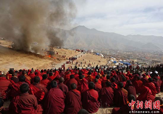 4月17日,青海省玉樹縣結古鎮(zhèn)附近的山坡上,眾多地震遇難者遺體被火葬。當日,為妥善及時處理遇難人員遺體,預防災區(qū)疫情的發(fā)生與流行,青海出臺地震遇難人員遺體處理意見,強調在處理遺體時要尊重少數(shù)民族喪葬習俗,尊重死者尊嚴。中新社發(fā) 盛佳鵬 攝