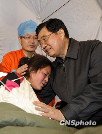 下午1時許,胡錦濤主席又驅(qū)車來到玉樹州體育場,看望正在接受治療的傷病員,了解傷員救治、藥械保障及疫病防控情況,并與傷員親切交談。
