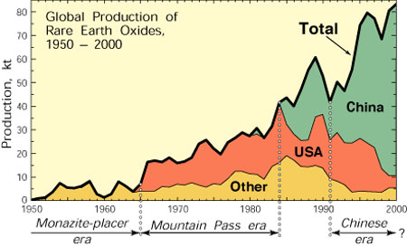 2000年前,各國稀土產(chǎn)量占全球比例的變化趨勢。