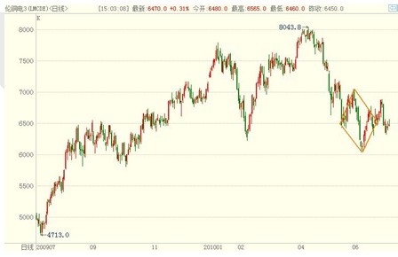 作為有色金屬期價變化的風向標,銅價的漲跌一直受到投資者密切關注。雖然2010年上半年,銅價在高位走出了類似于M頭的形態(tài),但是近期的下跌并未直接有效的擊穿頸線位置,而是出現(xiàn)了短期底部形態(tài)特征。如圖所示,倫銅M頭的頸線在6500美元一線,前期價格雖然跌穿此價位,但迅速反抽回到該價位上方,此 后一直圍繞著6500美元上下震蕩。值得注意的是在五、六月間的震蕩過程中,銅價走出了一個明顯的菱形,該菱形的中軸剛好在6500美元一線。菱形的出現(xiàn) 說明市場在此價位分歧巨大,菱形之后期價依然處在強勢震蕩之中,因此,這個菱形很有可能是短期底部的特征,也就是說后期銅價會出現(xiàn)較大幅度的反彈。