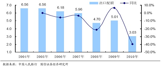 伴隨國(guó)家的多項(xiàng)重拳出擊,中國(guó)稀土出口企業(yè)正遭遇前所未有的配額緊缺。據(jù)商務(wù)部發(fā)布的配額指標(biāo)數(shù)據(jù)統(tǒng)計(jì),2010年,中國(guó)全年的稀土出口配額總數(shù)比2009年減少了近40%,這在中國(guó)稀土出口史上前所未有。