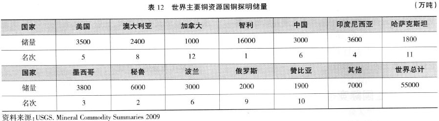 六、產(chǎn)業(yè)國(guó)際競(jìng)爭(zhēng)力 世界上生產(chǎn)銅礦的國(guó)家很多,比較著名的銅礦生產(chǎn)國(guó)有智利、秘魯、美國(guó)、中國(guó)、印度尼西亞、俄羅斯、加拿大、贊比亞、波蘭、哈薩克斯坦、墨西哥、伊朗等。與其他主要銅礦生產(chǎn)國(guó)相比,澳大利亞銅礦產(chǎn)業(yè)的國(guó)際競(jìng)爭(zhēng)力雖不占明顯優(yōu)勢(shì),但也絕不處于劣勢(shì),可在以下5個(gè)方面進(jìn)行大致比較。 1.資源儲(chǔ)量 關(guān)于澳大利亞的銅資源儲(chǔ)量,美國(guó)地質(zhì)調(diào)查局2009年數(shù)據(jù)與澳大利亞地球科學(xué)局2009數(shù)據(jù)有顯著不同,主要是分類標(biāo)準(zhǔn)不同造成的。但即使是按美國(guó)地質(zhì)調(diào)查局的數(shù)據(jù)和統(tǒng)計(jì)標(biāo)準(zhǔn),2008年澳大利亞探明銅資源儲(chǔ)量也為2400萬(wàn)噸,居世界第八位(見(jiàn)表12)。又據(jù)美國(guó)地質(zhì)調(diào)查局資料,如以EDR來(lái)進(jìn)行評(píng)估,則澳大利亞銅儲(chǔ)量占世界銅總儲(chǔ)量的12%,僅位于智利(占世界總儲(chǔ)量的30%)之后。