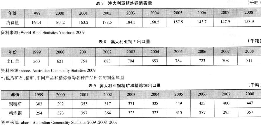 五、消費(fèi)、貿(mào)易和主要出口市場(chǎng) 10年來(lái),澳大利亞的精煉銅消費(fèi)見(jiàn)表7。由表7可見(jiàn),澳大利亞每年精煉銅消費(fèi)量大體保持穩(wěn)定,變化在188.5千噸-143.7千噸之間,10年中平均年消費(fèi)量為163.7千噸。總體上看,澳大利亞近5年(2004-2008)精煉銅消費(fèi)量比前5年(1999-2003)明顯走低。