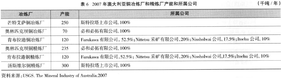 澳大利亞有3座銅冶煉廠和3座銅精煉廠,分別是芒特艾薩銅冶煉廠、奧林匹克壩銅冶煉廠、肯布拉港(Port Kembla)銅冶煉廠、奧林匹克壩銅精煉廠、肯布拉港銅精煉廠和湯斯維爾(Townsville)銅精煉廠。各冶煉廠與精煉廠的產(chǎn)能和所屬公司見(jiàn)表6。