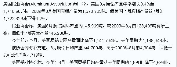 美國8月原鋁產(chǎn)量年率增長9.4%至1,718,667噸--鋁業(yè)協(xié)會(huì) |