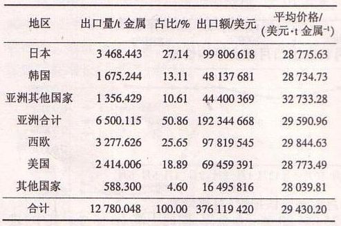 從出口鎢品看,主要出口到西歐和亞洲,占總量 的76.51%,同比增加5.97個(gè)百分點(diǎn);出口到美國(guó)占總量的18.89%,同比降低了7.47個(gè)百分點(diǎn);出口到其他地區(qū)只占總量的4.60%,同比降低了1.5個(gè)百分點(diǎn)(見(jiàn)表5)。