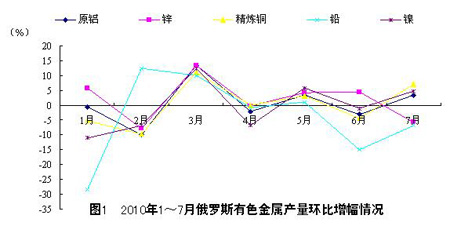 7月,俄羅斯鋅(未鍛軋非合金鋅)產(chǎn)量比2009年同期增長9.7%,而環(huán)比則下降5.9%;17月,俄羅斯鋅(未鍛軋非合金鋅)產(chǎn)量比2009年同期增長24.9%。