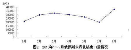 201017月,俄羅斯共出口未鍛軋鋁1965900噸,比2009年同期下降了4.0%。其中,7月俄羅斯出口未鍛軋鋁 370900噸,環(huán)比增長85.9%。整體來看,2010年以來,俄羅斯出口未鍛軋鋁以3月為分界線,13月為出口增長期,而36月為出口下降期,7 月則為觸底反彈,7月出口量較1月增長了74.1%。
