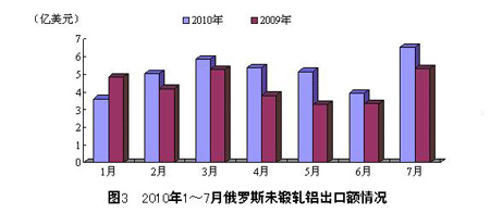 201017月,俄羅斯共出口未鍛軋鋁35.38億美元,比2009年同期增長18.1%。其中,7月,俄羅斯出口未鍛軋鋁6.5億美 元,環(huán)比增長65.8%,比2009年同期增長了22.4%。整體來看,2010年以來,俄羅斯未鍛軋鋁出口額在3月達(dá)到頂峰,此后一直向下滑落,7月觸 底反彈,此外,出口額除1月外均比2009年同期有較大幅度增長。