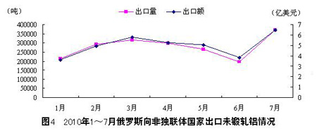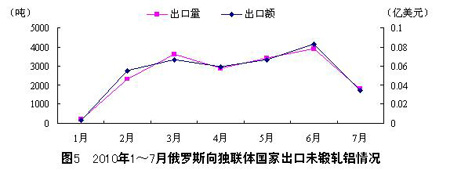 201017月,俄羅斯對獨(dú)聯(lián)體以外國家的未鍛軋鋁出口量總計(jì)為1947800噸,比2009年同期2035000噸的出口量下降4.3%;出 口額為35億美元,比2009年同期的29.76億美元增長17.6%。其中,7月對獨(dú)聯(lián)體以外國家的未鍛軋鋁出口量為369100噸,環(huán)比增長 88.6%;出口額為6.46億美元,環(huán)比增長68.2%。
