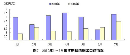 201017月,俄羅斯共出口精煉銅19.41億美元,比2009年同期10.3億美元的出口額增長了88.4%。其中,7月,俄羅斯出口精煉 3.35億美元,環(huán)比增長150.0%,同比增長35.6%。2010年以來,俄羅斯精煉銅出口額波動較大,基本呈漲跌互現(xiàn)的局面,最高峰出現(xiàn)在4月, 最低谷為6月,且與2009年同期相比,各月總體呈增長態(tài)勢。
