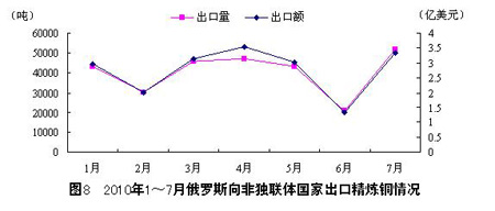 201017月,俄羅斯對獨(dú)聯(lián)體以外國家的精煉銅出口量總計(jì)為281800噸,比2009年同期的262200噸增長7.5%;出口額 19.35億美元,比2009年同期的10.27億美元增長88.4%。其中,7月對獨(dú)聯(lián)體以外國家的精煉銅出口量為51600噸,環(huán)比增長 149.3%,同比增長2.6%;出口額為3.35億美元,環(huán)比增長153.8%,同比增長36.2%。整體來看,2010年以來,俄羅斯對獨(dú)聯(lián)體以外國家的精煉銅出口波動較大,其中2月和6出現(xiàn)過嚴(yán)重下滑,而4月和7月則為增長高峰期,體現(xiàn)出銅出口非常不穩(wěn)定。