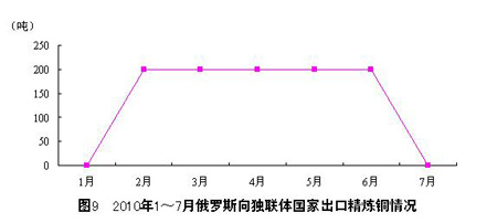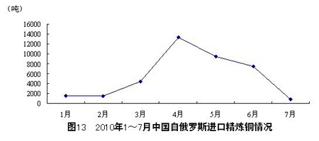 7月,中國自俄羅斯進(jìn)口精煉銅821噸,同比下降83.8%,占7月中國精煉銅進(jìn)口總量的0.4%。17月,中國自俄羅斯進(jìn)口精 煉銅38662噸,同比增長196.0%,占17月中國精煉銅進(jìn)口總量的2.2%。整體來看,2010年以來俄羅斯對華精煉銅出口在經(jīng)歷了前4個(gè)月的增 長后,57月呈現(xiàn)直線下滑趨勢,7月達(dá)到了谷底。