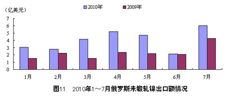 201017月,俄羅斯共出口未鍛軋鎳28.02億美元,比2009年同期16.15億美元的出口額增長了73.7%。其中,7月,俄 羅斯出口未鍛軋鎳6.02億美元,環(huán)比增長了186.7%,比2009年同期的4.28億美元增長了40.7%。整體來看,2010年以來,俄羅斯未鍛軋 鎳出口額在經(jīng)歷了前4個(gè)月的增長后,5月和6月均出現(xiàn)了下滑局面,7月則再次強(qiáng)勢回升,此外各月出口額均高于2009年同期。
