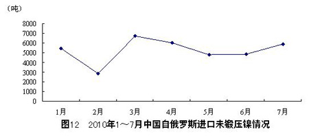 7月,中國自俄羅斯進(jìn)口未鍛壓鎳5884噸,同比下降54.4%,占7月中國未鍛壓鎳進(jìn)口總量的41.0%。17月,中國自俄羅 斯進(jìn)口未鍛壓鎳36587噸,同比下降28.3%,占17月中國未鍛壓鎳進(jìn)口總量的35.9%。整體來看,2010年以來,俄羅斯對華未鍛壓鎳出口波動 較大,最低谷出現(xiàn)在2月,最高峰出現(xiàn)在3月,此后出口量一直走低,6月和7月略有回升。