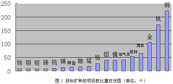 在933例項目中,從項目數(shù)量上來看,可分為四個等級。第一等級是企業(yè)境外投資項目,數(shù)量位列前三位的銅、鐵和黃金(其中勘查、開采項目以項目 的主礦種統(tǒng)計,伴生礦種未列入;并購案以目標(biāo)公司的主營礦種統(tǒng)計),項目數(shù)量分別都有上百例,遠(yuǎn)遠(yuǎn)高出其它礦種。其次是鉛鋅礦、鎳礦、鋁土礦、鉻鐵礦以及 石油、天然氣和煤炭等能源礦產(chǎn),投資項目數(shù)量分別在50例左右。第三等級是錳、鈾、鉀鹽、錫、鎢、銻、鉭、鉬、鋯礦,項目數(shù)量分別在十幾例左右。其它礦種 為鉑、鈀、鈷、鈦、寶石、螢石、大理石、石英、水晶、石膏、石墨等,項目數(shù)量都不多(圖1,圖2)。