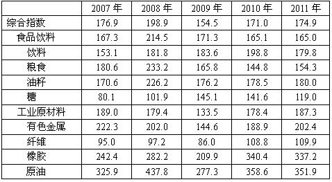 表1 2007-2011年國(guó)際商品價(jià)格走勢(shì)