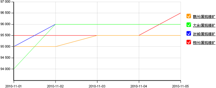 圖1:國(guó)內(nèi)主要地區(qū)黑鎢精礦日均價(jià)格走勢(shì)圖(單位:元/噸)