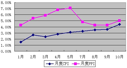 10 月數(shù)據(jù)公布之前,市場普遍預(yù)期,CPI會在4%左右,處于規(guī)避市場動蕩考慮,央行于本周三上調(diào)商業(yè)銀行存款準(zhǔn)備金25個基點,為年內(nèi)第四次上調(diào)存款準(zhǔn)備金 率。但4.4%的CPI數(shù)據(jù)公布出來之后,還是有點超出市場預(yù)期。另外,10月份PPI上漲5.0%,國際大宗商品價格上漲已經(jīng)逐漸向工業(yè)制成品上轉(zhuǎn)移。 國內(nèi)物價上漲已經(jīng)形成共識,預(yù)計后續(xù)央行將采取更多措施打壓通脹預(yù)期,年底之前或?qū)⒃俅渭酉ⅰ?/SPAN>