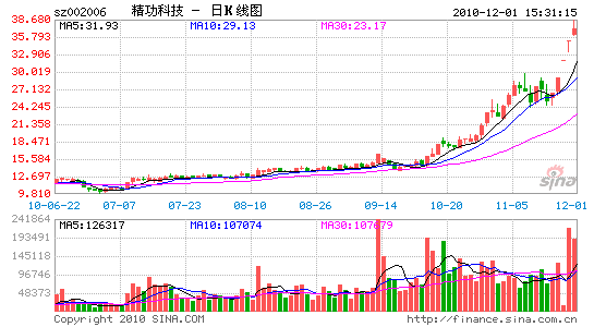 在大盤跌宕起伏后市不明之際,精功科技(002006)卻俘獲了四連陽,其中更有三個(gè)漲停板!得益于簽訂重大訂單的利好,以及多晶硅概念的炒作,近期的 精功科技成為兩市上耀眼的個(gè)股。昨日盤中,該股曾一度創(chuàng)出了38.68元的歷史新高。然而,伴隨著股價(jià)的突飛猛進(jìn),精功科技近期的成交量和換手率都明顯放 大。另外,值得注意的是,大部分機(jī)構(gòu)對(duì)公司目標(biāo)價(jià)的預(yù)計(jì)都在40~46元。昨日?qǐng)?bào)收的37.07元已向該價(jià)位迫近,近期的暴漲已經(jīng)開始積聚風(fēng)險(xiǎn)。