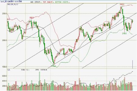 LME鋅合約日線目前靠近布林通道中軌,從位臵看其在布林通道中軌依舊有一定壓力,而下方支撐位在2080一線。
