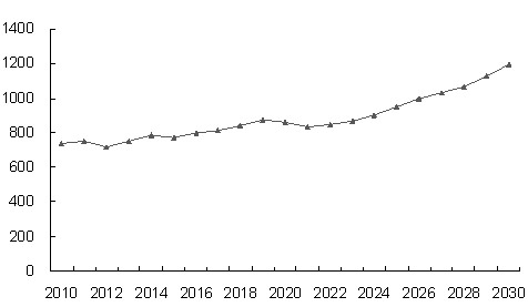 利用這種方法,結合歷史上全球的精銅 消費情況,我們可以估算出未來20年全球的廢銅回收量:2010年前后全球的廢銅回收量在790萬噸左右,此后將會緩慢上升,至2030年將達到1200 萬噸的水平�?傮w而言,未來全球的廢銅回收量將逐步上升,在全球銅原料供應中的地位不斷提高。
