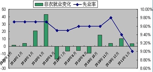 失業(yè)率由去年12月份的9.4%降至9.0%,低于市場預期的9.5%,大約有1386萬有就業(yè)意愿的美國公民未能找到工作。失業(yè)率為連續(xù)第二個月降低,但仍位于9%的高位。
