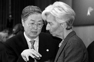 19日,法國財長拉加德同中國央行行長周小川(左)交談。 |