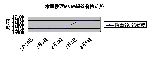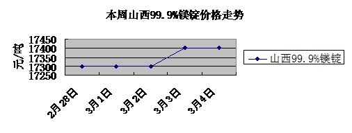 本周國內(nèi)鎂市運行平穩(wěn),成交價格穩(wěn)中有升,陜西地區(qū)99.9%鎂錠報價16900-17100元/噸,較上周漲100元,山西地區(qū)99.9%鎂錠報價17300-17500元/噸, 漲100元,寧夏地區(qū)報價為17300-17500元/噸。 99.9%鎂錠FOB出口價格基本在2950-2980美元/噸,高價難被接受,國外客戶傾向于長單交易。 目前鎂廠產(chǎn)能不足,庫存短缺且資金緊張為市場價格支撐點,需求平穩(wěn)之下,鎂價也基本穩(wěn)定。雖本周前期廠家以高成本以及庫存較少為由欲上調(diào)報價,但是當前需求還不足以消化較高價格。然3月末期產(chǎn)量或?qū)⒓哟�,流通性收緊導致廠家資金不足加上勞動力、環(huán)保以及原材料等一系列原因,產(chǎn)能增速不會擴張很快,產(chǎn)量有望隨需求回升而增長,3月份行情以穩(wěn)中偏強為主,下周各地區(qū)主流價格預維持本周不變。