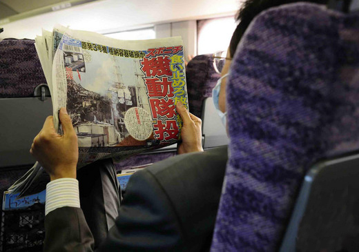 3月17日下午,在一列前往東京的新干線列車上,一名日本人在閱讀關(guān)于福島核電站三號機組最新狀況的報道。