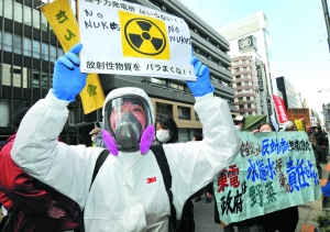 東京電力公司宣布,27日上午宣布的福島第一核電站2號(hào)機(jī)組渦輪機(jī)房地下室積水放射性物質(zhì)活度超標(biāo)1000萬倍的數(shù)值嚴(yán)重有誤,重新分析后發(fā)現(xiàn),其放射性活度超標(biāo)10萬倍左右,而非此前宣布的1000萬倍。圖為示威者27日在東電總部大樓前抗議。
