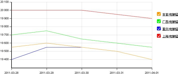 圖1:全國(guó)主要地區(qū)電解錳價(jià)格走勢(shì)圖(2011.3.28-2011.4.1)