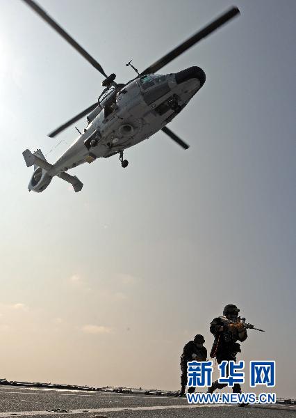 當(dāng)?shù)貢r(shí)間2010年11月16日凌晨,中國(guó)海軍第七批護(hù)航編隊(duì)駛?cè)雭喍澈S�,將在與第六批編隊(duì)任務(wù)交接后開始正式執(zhí)行護(hù)航任務(wù)。海軍第七批護(hù)航編隊(duì)在前 往護(hù)航海域的航渡期間,制定周密的反海盜針對(duì)性訓(xùn)練計(jì)劃,在艱苦環(huán)境中“走一路、練一路”,結(jié)合伴隨護(hù)航、區(qū)域護(hù)航、隨船護(hù)衛(wèi)等要求,完成了艦艇遠(yuǎn)海機(jī) 動(dòng)、艦機(jī)協(xié)同、攔截打擊快速小目標(biāo)、海上救援等訓(xùn)練科目。這是11月13日,中國(guó)海軍第七批護(hù)航編隊(duì)特戰(zhàn)隊(duì)員進(jìn)行直升機(jī)滑降訓(xùn)練。 新華社記者范軍威攝