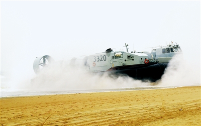 海軍新型氣墊艇沖上岸灘瞬間。朱子奇攝