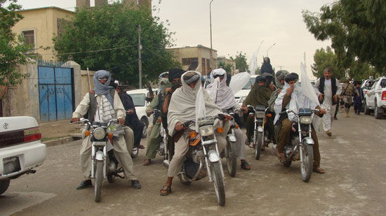 資料圖:4月11日,在阿富汗坎大哈,塔利班武裝分子騎著摩托車向政府投誠。