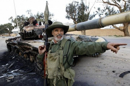 一名利比亞反政府武裝人員站在被擊毀的政府軍坦克旁邊