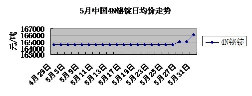 本月行情概況 自年初行情一路上揚后,3月底行情趨穩(wěn),4、5月份行情基本也基本平穩(wěn)過渡,5月中下旬行情再度企穩(wěn)回升。5月前期國內(nèi)鉍錠價格基本保持在162,000-165,000元/噸,后期行情逐漸攀升至165,000-167,000元/噸。 5月MB報價由11.2-11.7美元/磅漲到了11.4-12.3美元/磅,歐洲市場來自合金和制藥業(yè)的需求良好,成交價格突破12美元/磅