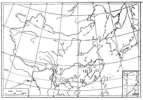 1—吉黑成礦帶;2—內蒙—大興安嶺成礦帶3——燕山成礦帶;4—東秦嶺成礦帶;5—祁連—西秦嶺成礦帶6—天山—北山成礦帶7—武當—淮陽隆起成礦帶8—下?lián)P子臺褶成礦帶9—東南沿海成礦帶10—江南臺隆成帶11—武夷山加里東隆起成礦帶12—湘贛粵加里東隆起成礦帶13—湘桂粵海西、印支坳陷成礦帶;14-康滇地軸成礦帶15—滇桂臺褶成礦帶16—三江錫鎢成礦帶
