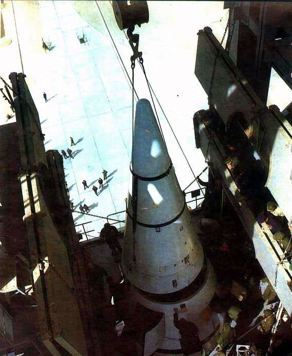 資料圖:解放軍二炮部隊東風(fēng)5洲際導(dǎo)彈吊裝模擬“核彈頭”。