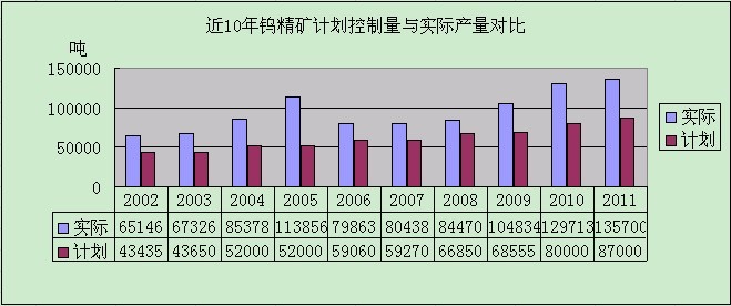 從圖中我們不難看出,近十年我國(guó)鎢精礦實(shí)際產(chǎn)量都嚴(yán)重超標(biāo),2010年鎢精礦計(jì)劃產(chǎn)量為8萬(wàn)噸,而實(shí)際達(dá)129713噸,2011年計(jì)劃87000噸,然而據(jù)統(tǒng)計(jì),實(shí)際產(chǎn)量首度突破13萬(wàn)噸,為135700噸。超采的影響是多方面的:一方面,大比例超采明顯壓制了鎢價(jià)上行;另一方面,加速了鎢這種稀有礦產(chǎn)資源的耗竭。