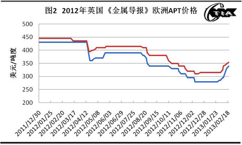 2013年1月,在春節(jié)來臨之際,中國(guó)鎢市場(chǎng)鎢礦供應(yīng)商惜售, APT、鎢粉末及硬質(zhì)合金生產(chǎn)企業(yè),都不同程度的做了春節(jié)原料庫(kù)存采購(gòu),交易量比2012年12月份有較大好轉(zhuǎn);春節(jié)后,中國(guó)鎢冶煉加工企業(yè)陸續(xù)重啟生產(chǎn)線,礦山生產(chǎn)線進(jìn)入正常生產(chǎn)狀態(tài)要晚些。從2013年2月始,國(guó)際鎢市場(chǎng),詢單和交易都有好轉(zhuǎn),中國(guó)鎢出口企業(yè)交易價(jià)格上調(diào)到350美元/噸度水平。