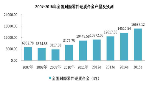 《高端裝備制造業(yè)“十二五”發(fā)展規(guī)劃》內(nèi)容,該規(guī)劃提出:到2015年,我國高端裝備制造業(yè)銷售收入由2010年的約1.6萬億元增長(zhǎng)至6萬億元以上,據(jù)此測(cè)算年復(fù)合增長(zhǎng)率高達(dá)30%。2011年我國硬質(zhì)合金耐磨零件產(chǎn)量約為1.04萬噸,若以保守15%增速估算,2015年我國硬質(zhì)合金耐磨零件產(chǎn)量將達(dá)到1.67萬噸。全國2007-2015年耐磨零件硬質(zhì)合金產(chǎn)量及預(yù)測(cè)如下圖所示: