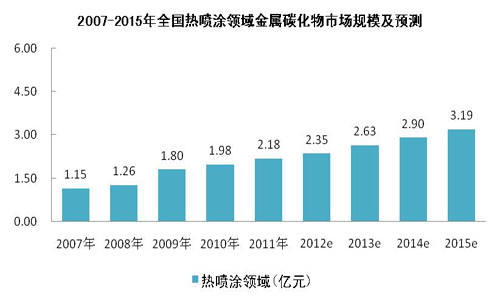 我國熱噴涂工業(yè)主要包括了設(shè)備、材料、噴涂工廠產(chǎn)值、進(jìn)口設(shè)備和材料等,其中熱噴涂材料占25%,金屬碳化物在熱噴涂材料中占12%。2011年熱噴涂所需稀有金屬碳化物市場(chǎng)規(guī)模約為2.18億元,根據(jù)中國表面工程協(xié)會(huì)熱噴涂專業(yè)委員會(huì)預(yù)測(cè) ,我國熱噴涂行業(yè)年增長(zhǎng)率為10%左右,預(yù)計(jì)2015年市場(chǎng)規(guī)模約為3.19億元。其中2011年碳化鉻在熱噴涂領(lǐng)域需求量約為484.44噸,根據(jù)熱噴涂行業(yè)的10%增速,到2015年需求量增長(zhǎng)至677.78噸。綜上,全國稀有金屬碳化物熱噴涂領(lǐng)域市場(chǎng)規(guī)模一覽如下圖所示: