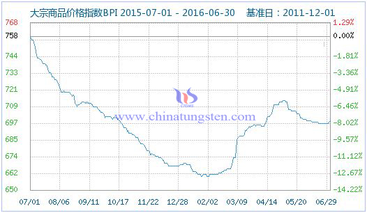 2016年6月30日大宗商品價格指數(shù)BPI為701點,較昨日上升了2點,較周期內(nèi)最高點1019點(2012-04-10)下降了31.21%,較2016年02月03日最低點660點上漲了6.21%。(注:周期指2011-12-01至今)