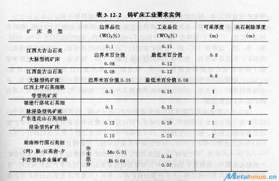 鎢礦產工業(yè)要求(或稱礦產工業(yè)要求),包括礦床邊界品位(WO3%)、工業(yè)品位(WO3%)、可采厚度(m)和夾石剔除厚度(m),對各類型礦床均有不同指標(表3.12.1);典型礦床工業(yè)要求實例見表3.12.2。