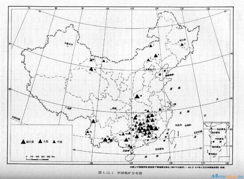 二、儲(chǔ)量分布 在全國已探明鎢礦儲(chǔ)量有21個(gè)省、自治區(qū)、直轄市。其中保有儲(chǔ)量在20萬t以上的有8個(gè)省區(qū),依次為湖南179.89萬t、江西110.09萬t、河南62.85萬t、廣西34.92萬t、福建30.67萬t、廣東23.02萬t、甘肅22.29萬t、云南21.66萬t,合計(jì)485.39萬t,占全國鎢保有儲(chǔ)量的91.7%(以1996年底全國鎢礦保有儲(chǔ)量統(tǒng)計(jì))。 從全國大行政區(qū)分布來看,依次:中南區(qū)占全國鎢儲(chǔ)量的58.2%,居首位,其次是華東區(qū)占28%、西北區(qū)占4.3%、西南占4.1%、東北區(qū)占3.2%、華北區(qū)占2.2%。 在三大經(jīng)濟(jì)地區(qū)鎢礦儲(chǔ)量分布的比例:東部沿海地區(qū)占17.1%、中部地區(qū)占75.1%、西部地區(qū)占7.8%。全國大中型、超大型鎢礦分布及其儲(chǔ)量和礦區(qū)開發(fā)利用情況見圖3.12.1和表3.12.4(圖中礦產(chǎn)地名編號(hào)與此表礦產(chǎn)地名編號(hào)相對(duì)應(yīng))。